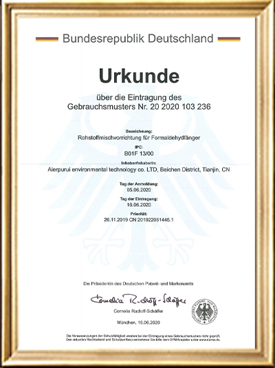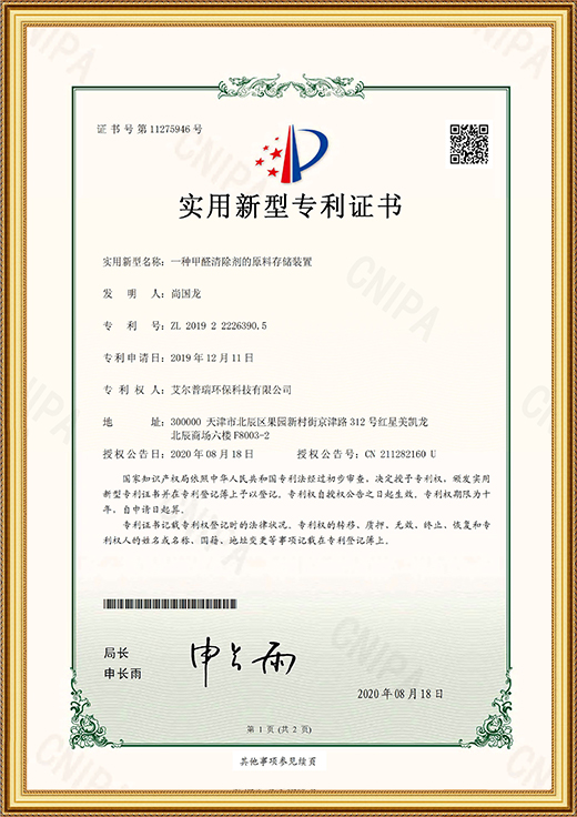 實用新型專利證書(一種甲醛清除劑的原料存儲